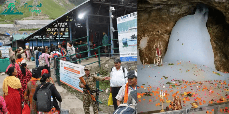 Benefits: This route offers a more scenic experience, taking you through lush valleys and beautiful landscapes. Upon reaching Panchtarni, a 6kms trek to the holy cave is required, as with the Baltal route.