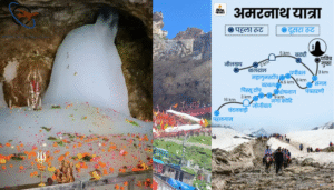 Key stops include Chandanwari, Sheshnag, Panchtarni, and finally, the Amarnath Cave.